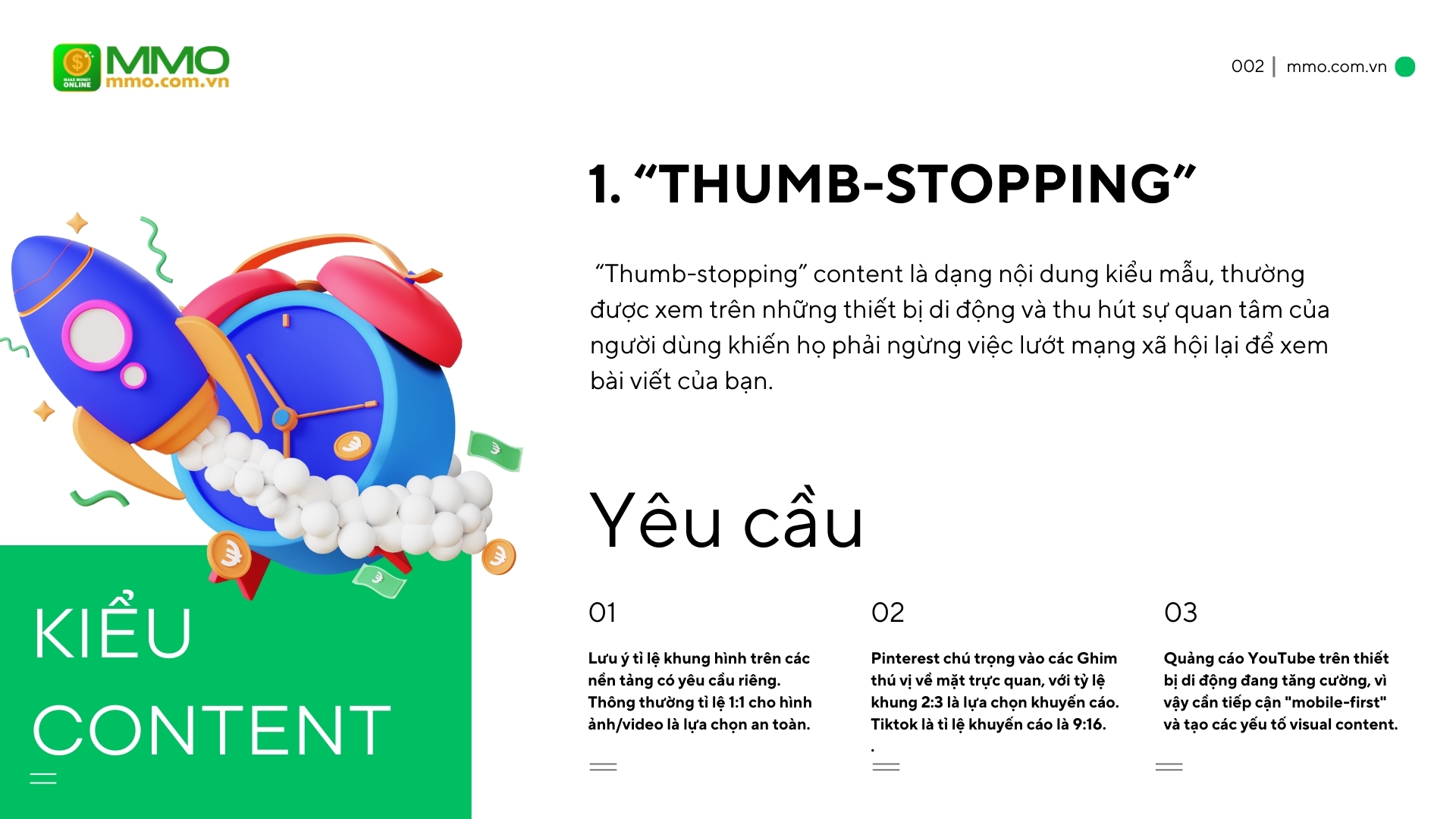 Sở hữu rất nhiều yếu tố cần phải xem xét, từ việc xây dựng hình ảnh và video ra sao để thích hợp với thị hiếu người dùng cho tới việc sử dụng câu chữ và CTA thế nào để thúc đẩy mạnh nhất tới hành động tiếp theo của họ. Tất cả đều phải được suy xét kỹ lưỡng. Đó là chưa kể tới việc hành vi của người dùng trên những nền tảng không giống nhau sẽ không giống nhau, thiết bị di động sẽ không giống với TV và không giống với những nền tảng số còn lại. Vì vậy, để có thể cạnh tranh được với những nhà quảng cáo khác trên thế giới trong thời điểm mà thiết bị di động đang lên ngôi lúc này, bạn phải biết phương pháp xây dựng những nội dung làm người dùng dừng chân lại (hay còn gọi là “thumb-stopping” content: dạng nội dung kiểu mẫu, thường được xem trên những thiết bị di động và thu hút sự chú ý làm người dùng dừng chân lại).